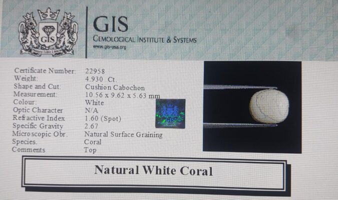 Beautiful 4.93 Ct. White Coral (Japanese Mines) Sava 5 Ratti Saphed Moonga. Free Horoscope & Free Pundit Ji Advise / Consultation. Original Natural Lab certified gems by IGI GTL / Birth stones / Large Gem Selection of shree shubh Rashi Ratan Vedic dhan at Gem Mines. May Bhagwan Brahma, Vishnu, Shiv & Universe bless you.