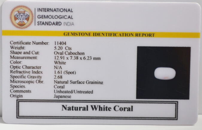 Beautiful 5.2 Cts Natural White Coral (AAA-Mines) sva 5+ Ratti WHITE CORAL. Free Horoscope & Free Pundit Ji Astrological Advise / Consultation. Original Natural Lab certified gems by IGI GTL / Birth stones / Large Gem Selection of shree shubh Rashi Ratan Vedic dhan at Gem Mines. May Bhagwan Brahma, Vishnu, Shiv & Universe bless you.