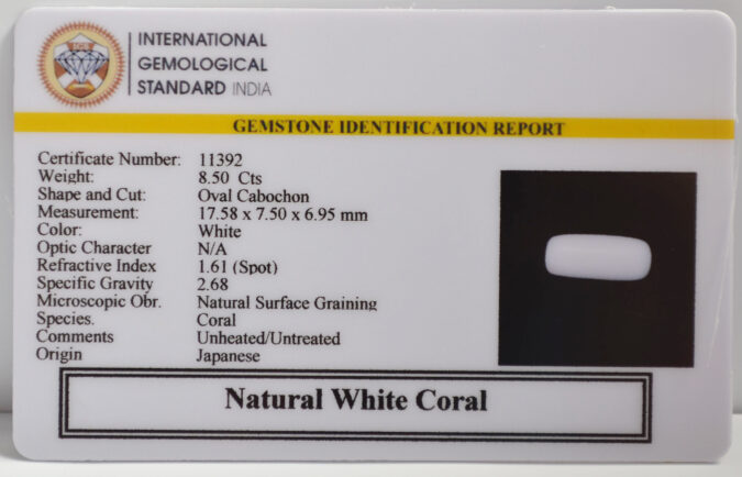 Beautiful 8.5 Cts Natural White Coral (AAA+-Mines) sva 9+ Ratti WHITE CORAL. Free Horoscope & Free Pundit Ji Astrological Advise / Consultation. Original Natural Lab certified gems by IGI GTL / Birth stones / Large Gem Selection of shree shubh Rashi Ratan Vedic dhan at Gem Mines. May Bhagwan Brahma, Vishnu, Shiv & Universe bless you.