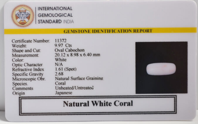 Certified Natural White Coral 9.97 Ct.(11+ Ratti) in Oval Cabochon shape