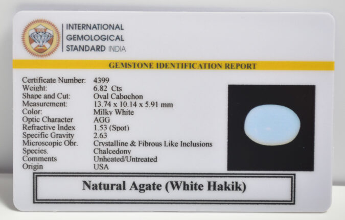 Certified Natural Agate (White Hakik) 6.82 Ct.(7+ Ratti) in Oval Cabochon shape