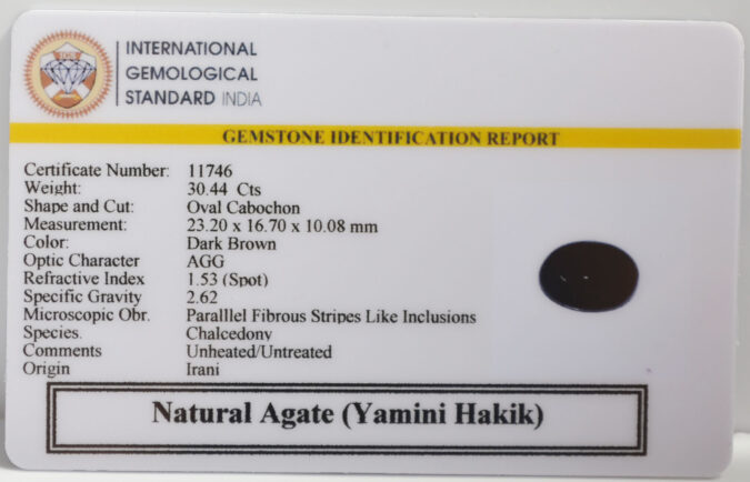 Beautiful 30.44 Cts Natural Yamini Agate (Yamini Hakik) (Top-Mines) sva 33+ Ratti YAMINI HAKIK. Free Horoscope & Free Pundit Ji Astrological Advise / Consultation. Original Natural Lab certified gems by IGI GTL / Birth stones / Large Gem Selection of shree shubh Rashi Ratan Vedic dhan at Gem Mines. May Bhagwan Brahma, Vishnu, Shiv & Universe bless you.