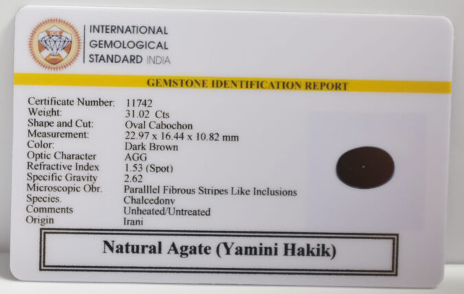 Beautiful 31.02 Cts Natural Yamini Agate (Yamini Hakik) (Top-Mines) sva 34+ Ratti YAMINI HAKIK. Free Horoscope & Free Pundit Ji Astrological Advise / Consultation. Original Natural Lab certified gems by IGI GTL / Birth stones / Large Gem Selection of shree shubh Rashi Ratan Vedic dhan at Gem Mines. May Bhagwan Brahma, Vishnu, Shiv & Universe bless you.