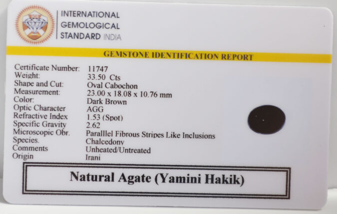 Beautiful 33.5 Cts Natural Yamini Agate (Yamini Hakik) (AAA+-Mines) sva 37+ Ratti YAMINI HAKIK. Free Horoscope & Free Pundit Ji Astrological Advise / Consultation. Original Natural Lab certified gems by IGI GTL / Birth stones / Large Gem Selection of shree shubh Rashi Ratan Vedic dhan at Gem Mines. May Bhagwan Brahma, Vishnu, Shiv & Universe bless you.