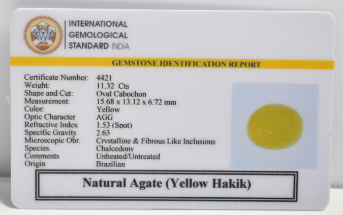 Beautiful 11.32 Cts Natural Agate (Yellow Hakik) (Top+-Mines) sva 12+ Ratti YELLOW HAKIK. Free Horoscope & Free Pundit Ji Astrological Advise / Consultation. Original Natural Lab certified gems by IGI GTL / Birth stones / Large Gem Selection of shree shubh Rashi Ratan Vedic dhan at Gem Mines. May Bhagwan Brahma, Vishnu, Shiv & Universe bless you.
