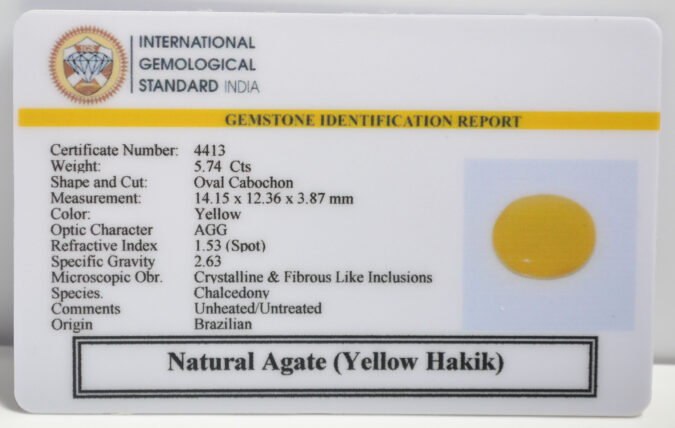 Beautiful 5.74 Cts Natural Agate (Yellow Hakik) (Top+-Mines) sva 6+ Ratti YELLOW HAKIK. Free Horoscope & Free Pundit Ji Astrological Advise / Consultation. Original Natural Lab certified gems by IGI GTL / Birth stones / Large Gem Selection of shree shubh Rashi Ratan Vedic dhan at Gem Mines. May Bhagwan Brahma, Vishnu, Shiv & Universe bless you.