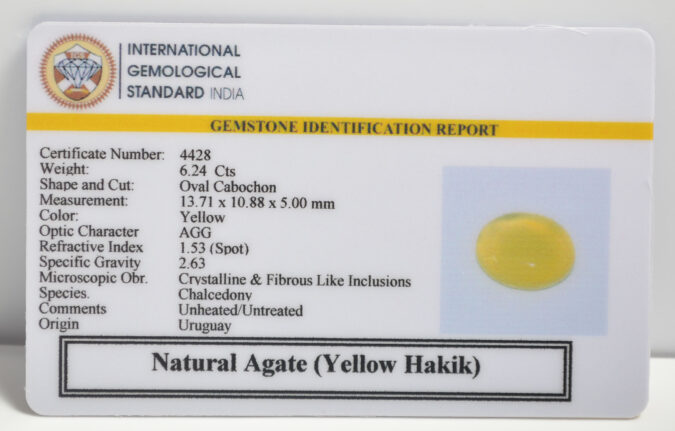 Beautiful 6.24 Cts Natural Agate (Yellow Hakik) (Top-Mines) sva 6+ Ratti YELLOW HAKIK. Free Horoscope & Free Pundit Ji Astrological Advise / Consultation. Original Natural Lab certified gems by IGI GTL / Birth stones / Large Gem Selection of shree shubh Rashi Ratan Vedic dhan at Gem Mines. May Bhagwan Brahma, Vishnu, Shiv & Universe bless you.
