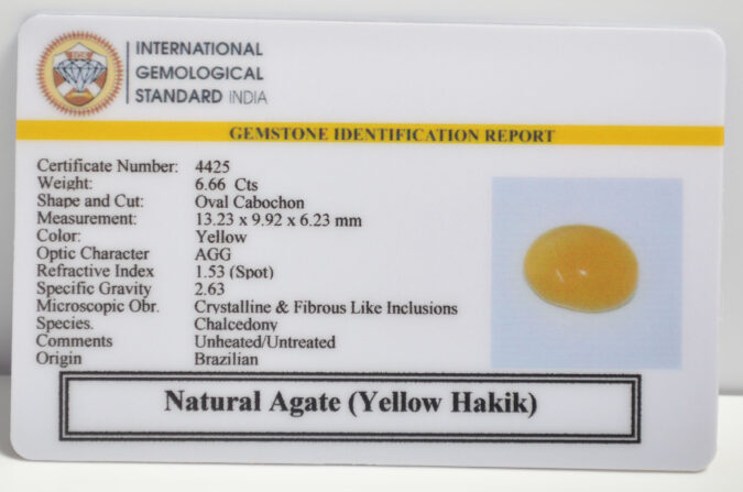 Beautiful 6.66 Cts Natural Agate (Yellow Hakik) (Top+-Mines) sva 7+ Ratti YELLOW HAKIK. Free Horoscope & Free Pundit Ji Astrological Advise / Consultation. Original Natural Lab certified gems by IGI GTL / Birth stones / Large Gem Selection of shree shubh Rashi Ratan Vedic dhan at Gem Mines. May Bhagwan Brahma, Vishnu, Shiv & Universe bless you.