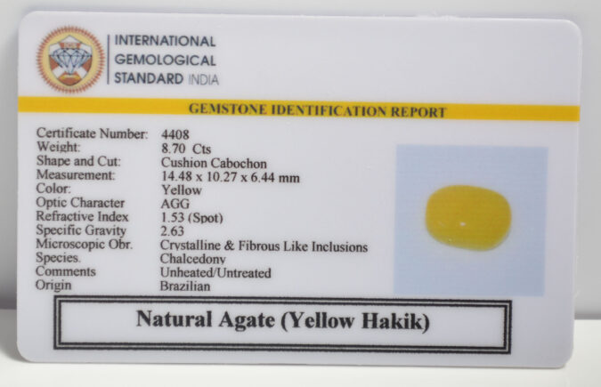 Beautiful 8.7 Cts Natural Agate (Yellow Hakik) (Top+-Mines) sva 9+ Ratti YELLOW HAKIK. Free Horoscope & Free Pundit Ji Astrological Advise / Consultation. Original Natural Lab certified gems by IGI GTL / Birth stones / Large Gem Selection of shree shubh Rashi Ratan Vedic dhan at Gem Mines. May Bhagwan Brahma, Vishnu, Shiv & Universe bless you.