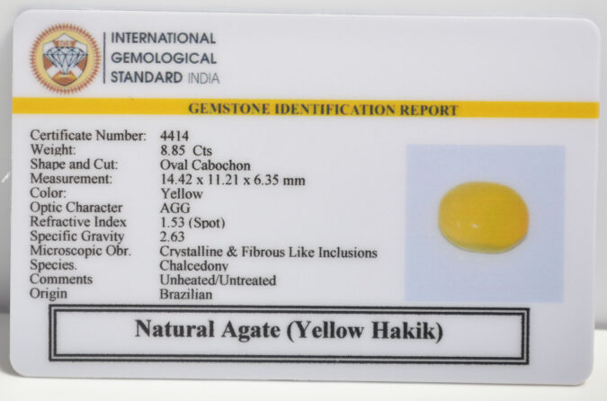 Beautiful 8.85 Cts Natural Agate (Yellow Hakik) (Top+-Mines) sva 9+ Ratti YELLOW HAKIK. Free Horoscope & Free Pundit Ji Astrological Advise / Consultation. Original Natural Lab certified gems by IGI GTL / Birth stones / Large Gem Selection of shree shubh Rashi Ratan Vedic dhan at Gem Mines. May Bhagwan Brahma, Vishnu, Shiv & Universe bless you.
