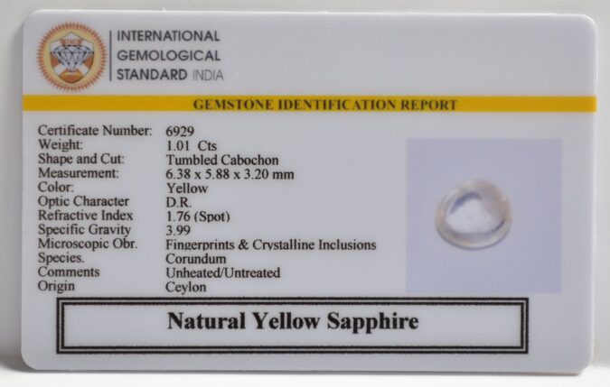 Beautiful 1.01 Cts Natural Yellow Sapphire (Very Good-Mines) sva 1+ Ratti YELLOW SAPPHIRE. Free Horoscope & Free Pundit Ji Astrological Advise / Consultation. Original Natural Lab certified gems by IGI GTL / Birth stones / Large Gem Selection of shree shubh Rashi Ratan Vedic dhan at Gem Mines. May Bhagwan Brahma, Vishnu, Shiv & Universe bless you.