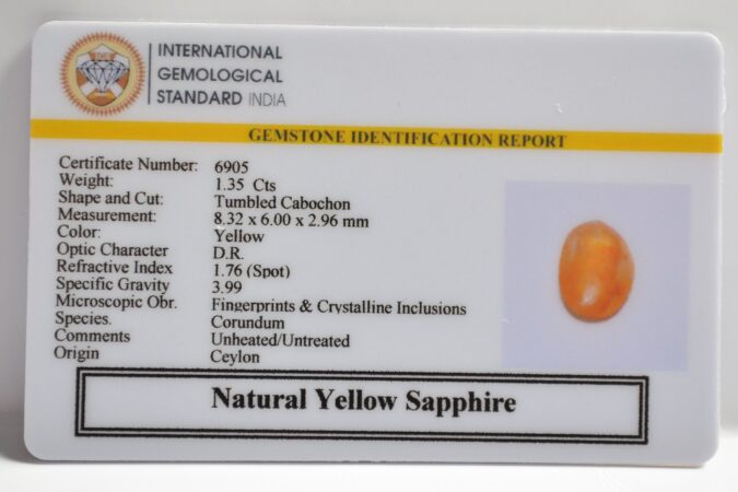 Beautiful 1.35 Cts Natural Yellow Sapphire (AAA-Mines) sva 1+ Ratti YELLOW SAPPHIRE. Free Horoscope & Free Pundit Ji Astrological Advise / Consultation. Original Natural Lab certified gems by IGI GTL / Birth stones / Large Gem Selection of shree shubh Rashi Ratan Vedic dhan at Gem Mines. May Bhagwan Brahma, Vishnu, Shiv & Universe bless you.