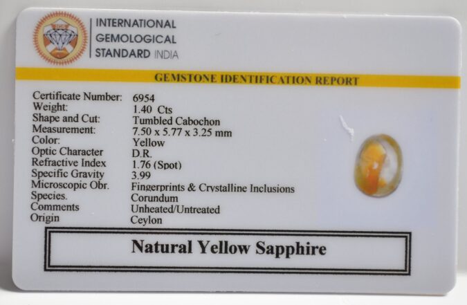 Beautiful 1.4 Cts Natural Yellow Sapphire (Very Good-Mines) sva 1+ Ratti YELLOW SAPPHIRE. Free Horoscope & Free Pundit Ji Astrological Advise / Consultation. Original Natural Lab certified gems by IGI GTL / Birth stones / Large Gem Selection of shree shubh Rashi Ratan Vedic dhan at Gem Mines. May Bhagwan Brahma, Vishnu, Shiv & Universe bless you.