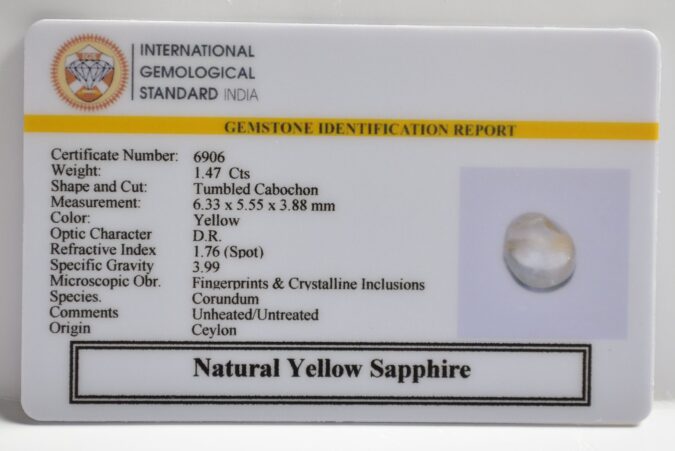 Beautiful 1.47 Cts Natural Yellow Sapphire (AAA-Mines) sva 1+ Ratti YELLOW SAPPHIRE. Free Horoscope & Free Pundit Ji Astrological Advise / Consultation. Original Natural Lab certified gems by IGI GTL / Birth stones / Large Gem Selection of shree shubh Rashi Ratan Vedic dhan at Gem Mines. May Bhagwan Brahma, Vishnu, Shiv & Universe bless you.