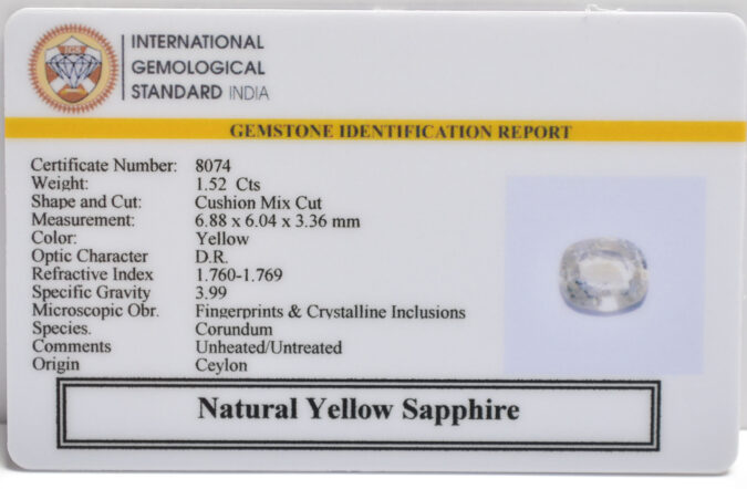 Beautiful 1.52 Cts Natural Yellow Sapphire (AAA+-Mines) sva 1+ Ratti YELLOW SAPPHIRE. Free Horoscope & Free Pundit Ji Astrological Advise / Consultation. Original Natural Lab certified gems by IGI GTL / Birth stones / Large Gem Selection of shree shubh Rashi Ratan Vedic dhan at Gem Mines. May Bhagwan Brahma, Vishnu, Shiv & Universe bless you.