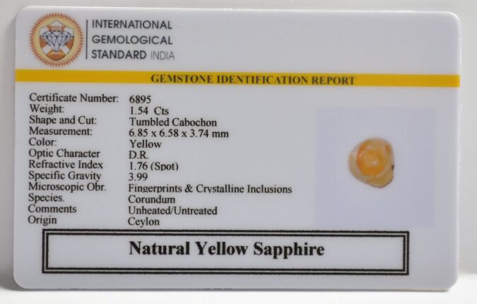 Beautiful 1.54 Cts Natural Yellow Sapphire (AAA-Mines) sva 1+ Ratti YELLOW SAPPHIRE. Free Horoscope & Free Pundit Ji Astrological Advise / Consultation. Original Natural Lab certified gems by IGI GTL / Birth stones / Large Gem Selection of shree shubh Rashi Ratan Vedic dhan at Gem Mines. May Bhagwan Brahma, Vishnu, Shiv & Universe bless you.