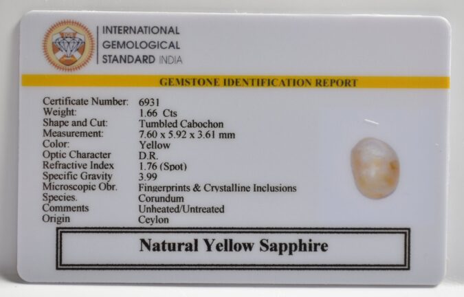 Beautiful 1.66 Cts Natural Yellow Sapphire (Good-Mines) sva 1+ Ratti YELLOW SAPPHIRE. Free Horoscope & Free Pundit Ji Astrological Advise / Consultation. Original Natural Lab certified gems by IGI GTL / Birth stones / Large Gem Selection of shree shubh Rashi Ratan Vedic dhan at Gem Mines. May Bhagwan Brahma, Vishnu, Shiv & Universe bless you.