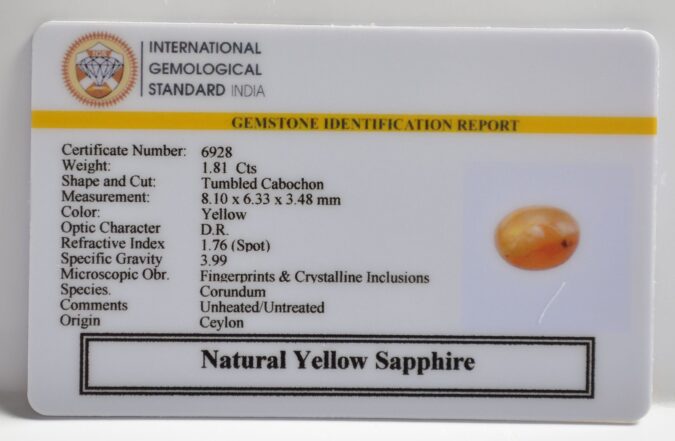 Beautiful 1.81 Cts Natural Yellow Sapphire (Very Good-Mines) sva 2+ Ratti YELLOW SAPPHIRE. Free Horoscope & Free Pundit Ji Astrological Advise / Consultation. Original Natural Lab certified gems by IGI GTL / Birth stones / Large Gem Selection of shree shubh Rashi Ratan Vedic dhan at Gem Mines. May Bhagwan Brahma, Vishnu, Shiv & Universe bless you.