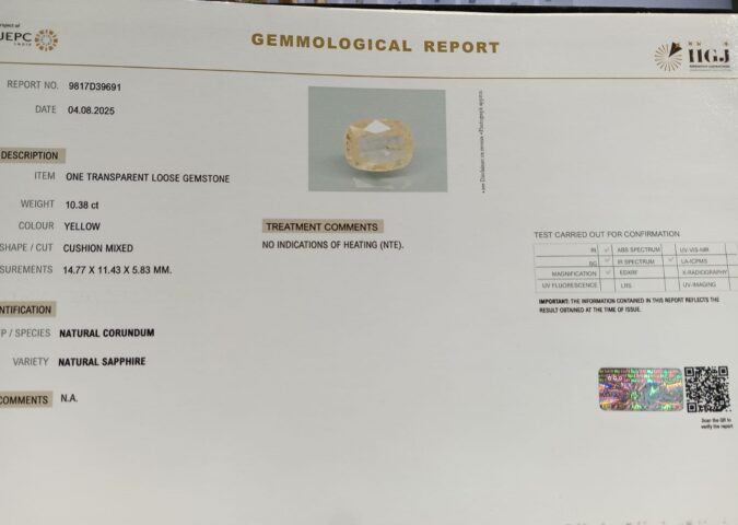 Beautiful 10.38 Cts Natural Yellow Sapphire (AAA+-Mines) sva 11+ Ratti YELLOW SAPPHIRE. Free Horoscope & Free Pundit Ji Astrological Advise / Consultation. Original Natural Lab certified gems by IGI GTL / Birth stones / Large Gem Selection of shree shubh Rashi Ratan Vedic dhan at Gem Mines. May Bhagwan Brahma, Vishnu, Shiv & Universe bless you.