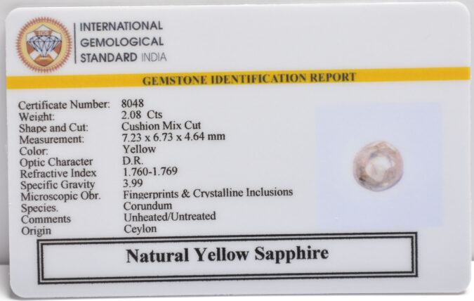 Beautiful 2.08 Cts Natural Yellow Sapphire (AAA-Mines) sva 2+ Ratti YELLOW SAPPHIRE. Free Horoscope & Free Pundit Ji Astrological Advise / Consultation. Original Natural Lab certified gems by IGI GTL / Birth stones / Large Gem Selection of shree shubh Rashi Ratan Vedic dhan at Gem Mines. May Bhagwan Brahma, Vishnu, Shiv & Universe bless you.