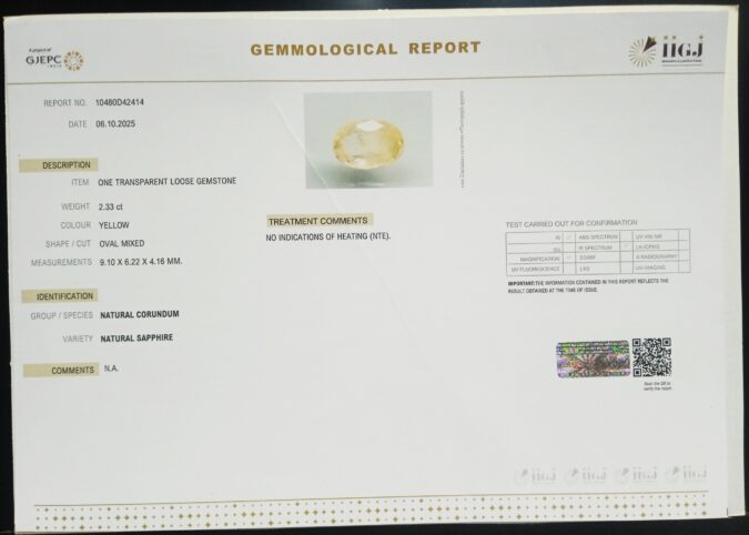 Beautiful 2.33 Cts NATURAL SAPPHIRE (Very Good-Mines) sva 2+ Ratti YELLOW SAPPHIRE. Free Horoscope & Free Pundit Ji Astrological Advise / Consultation. Original Natural Lab certified gems by IGI GTL / Birth stones / Large Gem Selection of shree shubh Rashi Ratan Vedic dhan at Gem Mines. May Bhagwan Brahma, Vishnu, Shiv & Universe bless you.
