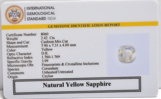 Beautiful 2.42 Cts Natural Yellow Sapphire (AAA+-Mines) sva 2+ Ratti YELLOW SAPPHIRE. Free Horoscope & Free Pundit Ji Astrological Advise / Consultation. Original Natural Lab certified gems by IGI GTL / Birth stones / Large Gem Selection of shree shubh Rashi Ratan Vedic dhan at Gem Mines. May Bhagwan Brahma, Vishnu, Shiv & Universe bless you.