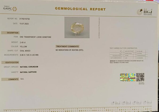 Beautiful 2.43 Ct. Natural Yellow Sapphire (Top-Mines) sva 2+ Ratti Pukhraj. Free Horoscope & Free Pundit Ji Astrological Advise / Consultation. Original Natural Lab certified gems by IGI GTL / Birth stones / Large Gem Selection of shree shubh Rashi Ratan Vedic dhan at Gem Mines. May Bhagwan Brahma, Vishnu, Shiv & Universe bless you.