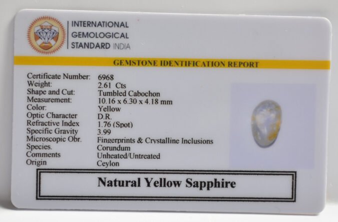 Beautiful 2.61 Cts Natural Yellow Sapphire (Very Good-Mines) sva 2+ Ratti YELLOW SAPPHIRE. Free Horoscope & Free Pundit Ji Astrological Advise / Consultation. Original Natural Lab certified gems by IGI GTL / Birth stones / Large Gem Selection of shree shubh Rashi Ratan Vedic dhan at Gem Mines. May Bhagwan Brahma, Vishnu, Shiv & Universe bless you.