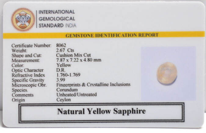 Beautiful 2.67 Cts Natural Yellow Sapphire (AAA-Mines) sva 2+ Ratti YELLOW SAPPHIRE. Free Horoscope & Free Pundit Ji Astrological Advise / Consultation. Original Natural Lab certified gems by IGI GTL / Birth stones / Large Gem Selection of shree shubh Rashi Ratan Vedic dhan at Gem Mines. May Bhagwan Brahma, Vishnu, Shiv & Universe bless you.