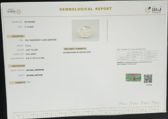 Beautiful 2.72 Cts NATURAL SAPPHIRE (AAA-Mines) sva 3+ Ratti YELLOW SAPPHIRE. Free Horoscope & Free Pundit Ji Astrological Advise / Consultation. Original Natural Lab certified gems by IGI GTL / Birth stones / Large Gem Selection of shree shubh Rashi Ratan Vedic dhan at Gem Mines. May Bhagwan Brahma, Vishnu, Shiv & Universe bless you.