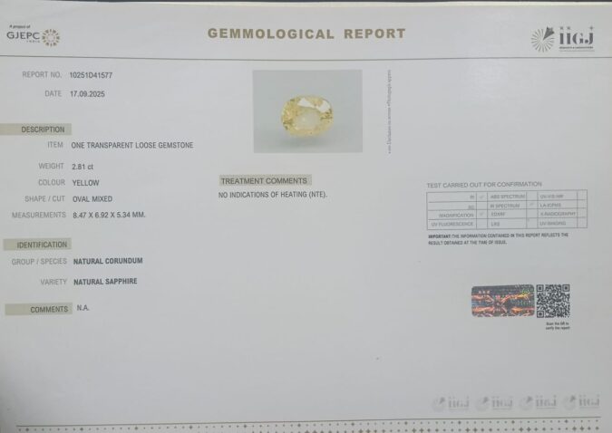 Beautiful 2.81 Cts Natural Yellow Sapphire (Top++-Mines) sva 3+ Ratti YELLOW SAPPHIRE. Free Horoscope & Free Pundit Ji Astrological Advise / Consultation. Original Natural Lab certified gems by IGI GTL / Birth stones / Large Gem Selection of shree shubh Rashi Ratan Vedic dhan at Gem Mines. May Bhagwan Brahma, Vishnu, Shiv & Universe bless you.