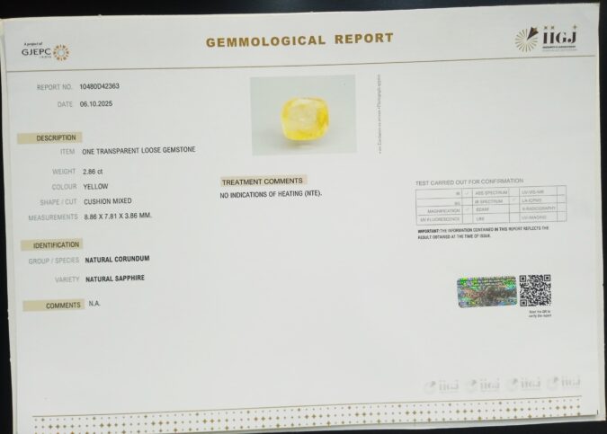 Beautiful 2.86 Cts NATURAL SAPPHIRE (AAA-Mines) sva 3+ Ratti YELLOW SAPPHIRE. Free Horoscope & Free Pundit Ji Astrological Advise / Consultation. Original Natural Lab certified gems by IGI GTL / Birth stones / Large Gem Selection of shree shubh Rashi Ratan Vedic dhan at Gem Mines. May Bhagwan Brahma, Vishnu, Shiv & Universe bless you.