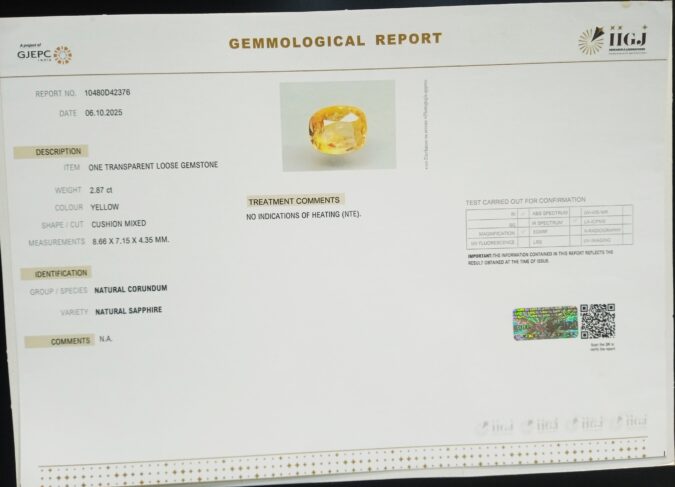 Beautiful 2.87 Cts NATURAL SAPPHIRE (AAA-Mines) sva 3+ Ratti YELLOW SAPPHIRE. Free Horoscope & Free Pundit Ji Astrological Advise / Consultation. Original Natural Lab certified gems by IGI GTL / Birth stones / Large Gem Selection of shree shubh Rashi Ratan Vedic dhan at Gem Mines. May Bhagwan Brahma, Vishnu, Shiv & Universe bless you.