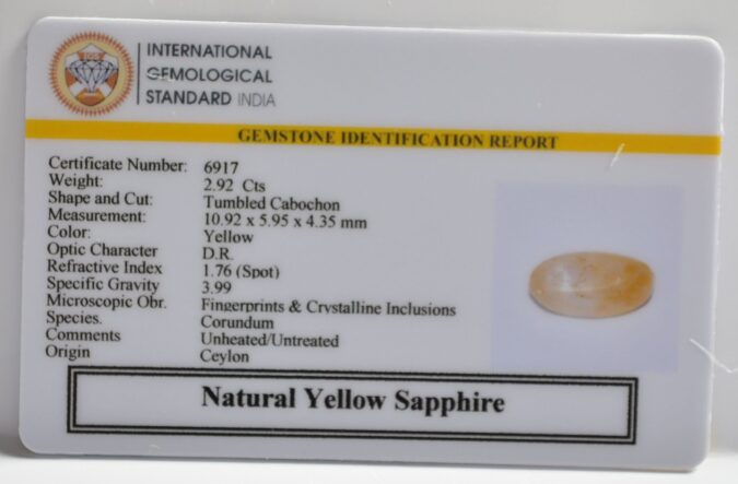 Beautiful 2.92 Cts Natural Yellow Sapphire (AAA-Mines) sva 3+ Ratti YELLOW SAPPHIRE. Free Horoscope & Free Pundit Ji Astrological Advise / Consultation. Original Natural Lab certified gems by IGI GTL / Birth stones / Large Gem Selection of shree shubh Rashi Ratan Vedic dhan at Gem Mines. May Bhagwan Brahma, Vishnu, Shiv & Universe bless you.