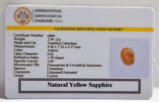 Certified Natural Yellow Sapphire 2.99 Ct.(3+ Ratti) in Tumbled Cabochon shape