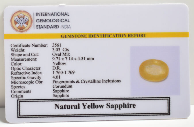 Beautiful 3.03 Cts Natural Yellow Sapphire (AAA-Mines) sva 3+ Ratti YELLOW SAPPHIRE. Free Horoscope & Free Pundit Ji Astrological Advise / Consultation. Original Natural Lab certified gems by IGI GTL / Birth stones / Large Gem Selection of shree shubh Rashi Ratan Vedic dhan at Gem Mines. May Bhagwan Brahma, Vishnu, Shiv & Universe bless you.