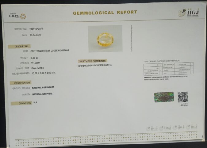 Beautiful 3.08 Cts NATURAL SAPPHIRE (Top-Mines) sva 3+ Ratti YELLOW SAPPHIRE. Free Horoscope & Free Pundit Ji Astrological Advise / Consultation. Original Natural Lab certified gems by IGI GTL / Birth stones / Large Gem Selection of shree shubh Rashi Ratan Vedic dhan at Gem Mines. May Bhagwan Brahma, Vishnu, Shiv & Universe bless you.
