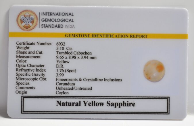 Certified Natural Yellow Sapphire 3.1 Ct.(3+ Ratti) in Tumbled Cabochon shape