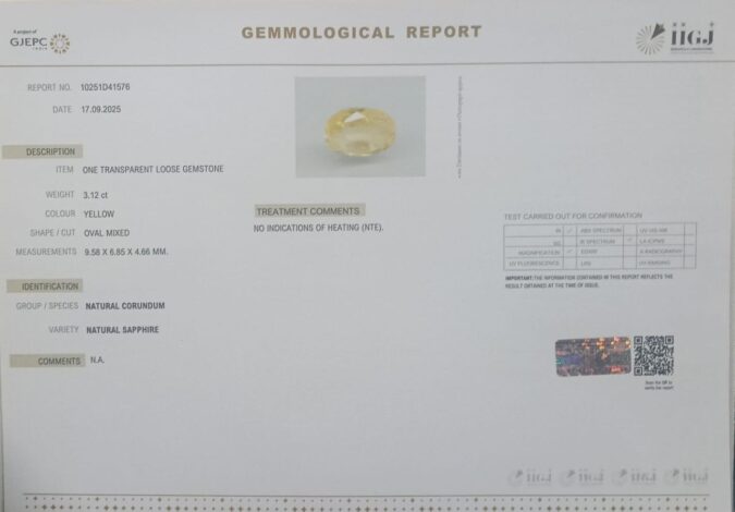 Beautiful 3.12 Cts Natural Yellow Sapphire (Top-Mines) sva 3+ Ratti YELLOW SAPPHIRE. Free Horoscope & Free Pundit Ji Astrological Advise / Consultation. Original Natural Lab certified gems by IGI GTL / Birth stones / Large Gem Selection of shree shubh Rashi Ratan Vedic dhan at Gem Mines. May Bhagwan Brahma, Vishnu, Shiv & Universe bless you.