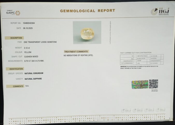 Beautiful 3.12 Cts NATURAL SAPPHIRE (Very Good-Mines) sva 3+ Ratti YELLOW SAPPHIRE. Free Horoscope & Free Pundit Ji Astrological Advise / Consultation. Original Natural Lab certified gems by IGI GTL / Birth stones / Large Gem Selection of shree shubh Rashi Ratan Vedic dhan at Gem Mines. May Bhagwan Brahma, Vishnu, Shiv & Universe bless you.
