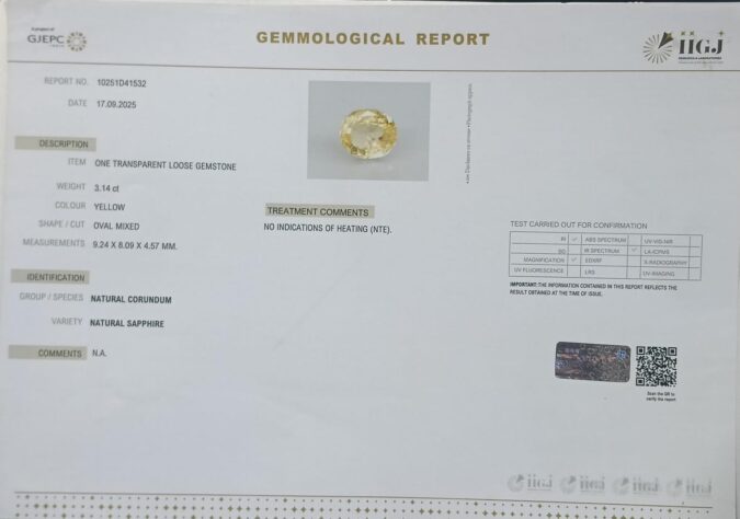 Beautiful 3.14 Cts Natural Yellow Sapphire (Top++-Mines) sva 3+ Ratti YELLOW SAPPHIRE. Free Horoscope & Free Pundit Ji Astrological Advise / Consultation. Original Natural Lab certified gems by IGI GTL / Birth stones / Large Gem Selection of shree shubh Rashi Ratan Vedic dhan at Gem Mines. May Bhagwan Brahma, Vishnu, Shiv & Universe bless you.