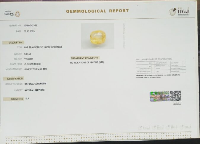 Beautiful 3.25 Cts NATURAL SAPPHIRE (Very Good-Mines) sva 3+ Ratti YELLOW SAPPHIRE. Free Horoscope & Free Pundit Ji Astrological Advise / Consultation. Original Natural Lab certified gems by IGI GTL / Birth stones / Large Gem Selection of shree shubh Rashi Ratan Vedic dhan at Gem Mines. May Bhagwan Brahma, Vishnu, Shiv & Universe bless you.