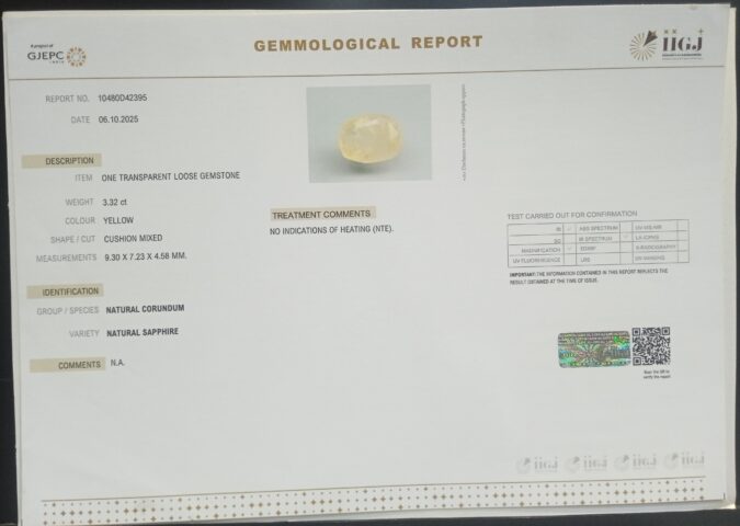 Beautiful 3.32 Cts NATURAL SAPPHIRE (Very Good-Mines) sva 3+ Ratti YELLOW SAPPHIRE. Free Horoscope & Free Pundit Ji Astrological Advise / Consultation. Original Natural Lab certified gems by IGI GTL / Birth stones / Large Gem Selection of shree shubh Rashi Ratan Vedic dhan at Gem Mines. May Bhagwan Brahma, Vishnu, Shiv & Universe bless you.
