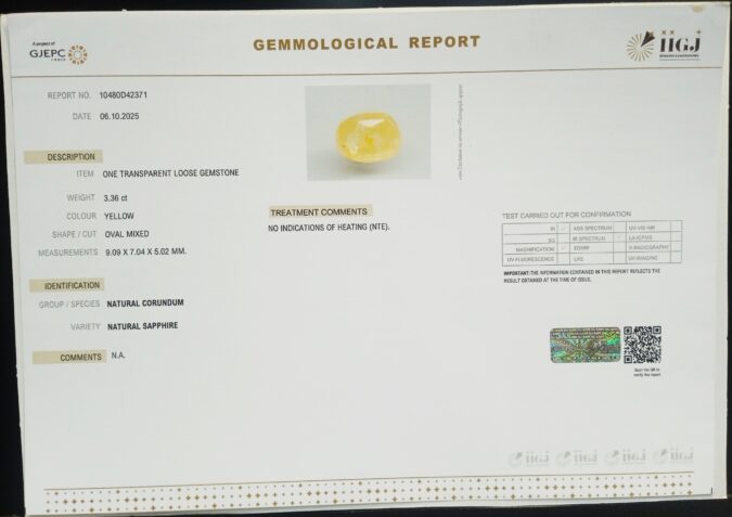 Beautiful 3.36 Cts NATURAL SAPPHIRE (Very Good-Mines) sva 3+ Ratti YELLOW SAPPHIRE. Free Horoscope & Free Pundit Ji Astrological Advise / Consultation. Original Natural Lab certified gems by IGI GTL / Birth stones / Large Gem Selection of shree shubh Rashi Ratan Vedic dhan at Gem Mines. May Bhagwan Brahma, Vishnu, Shiv & Universe bless you.