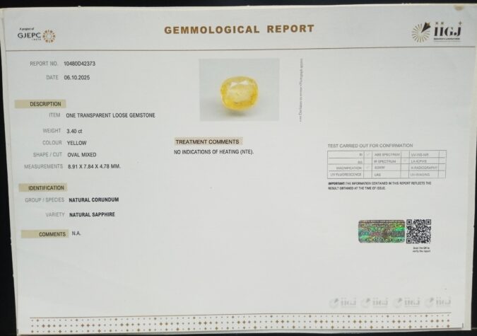 Beautiful 3.4 Cts NATURAL SAPPHIRE (AAA-Mines) sva 3+ Ratti YELLOW SAPPHIRE. Free Horoscope & Free Pundit Ji Astrological Advise / Consultation. Original Natural Lab certified gems by IGI GTL / Birth stones / Large Gem Selection of shree shubh Rashi Ratan Vedic dhan at Gem Mines. May Bhagwan Brahma, Vishnu, Shiv & Universe bless you.