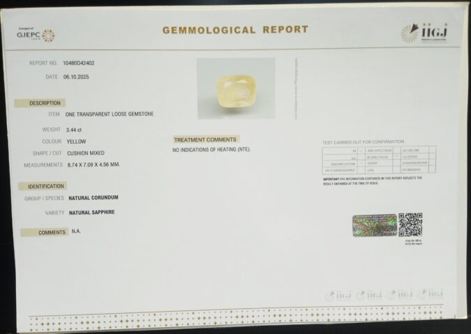 Beautiful 3.44 Cts NATURAL SAPPHIRE (Very Good-Mines) sva 3+ Ratti YELLOW SAPPHIRE. Free Horoscope & Free Pundit Ji Astrological Advise / Consultation. Original Natural Lab certified gems by IGI GTL / Birth stones / Large Gem Selection of shree shubh Rashi Ratan Vedic dhan at Gem Mines. May Bhagwan Brahma, Vishnu, Shiv & Universe bless you.