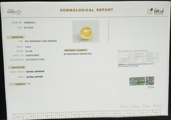 Beautiful 3.46 Cts NATURAL SAPPHIRE (Very Good-Mines) sva 3+ Ratti YELLOW SAPPHIRE. Free Horoscope & Free Pundit Ji Astrological Advise / Consultation. Original Natural Lab certified gems by IGI GTL / Birth stones / Large Gem Selection of shree shubh Rashi Ratan Vedic dhan at Gem Mines. May Bhagwan Brahma, Vishnu, Shiv & Universe bless you.