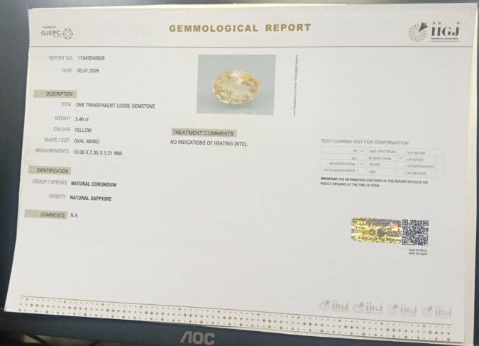 Beautiful 3.46 Cts Natural Yellow Sapphire (AAA+-Mines) sva 3+ Ratti YELLOW SAPPHIRE. Free Horoscope & Free Pundit Ji Astrological Advise / Consultation. Original Natural Lab certified gems by IGI GTL / Birth stones / Large Gem Selection of shree shubh Rashi Ratan Vedic dhan at Gem Mines. May Bhagwan Brahma, Vishnu, Shiv & Universe bless you.