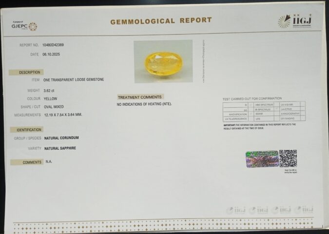 Beautiful 3.62 Cts NATURAL SAPPHIRE (AAA-Mines) sva 4+ Ratti YELLOW SAPPHIRE. Free Horoscope & Free Pundit Ji Astrological Advise / Consultation. Original Natural Lab certified gems by IGI GTL / Birth stones / Large Gem Selection of shree shubh Rashi Ratan Vedic dhan at Gem Mines. May Bhagwan Brahma, Vishnu, Shiv & Universe bless you.