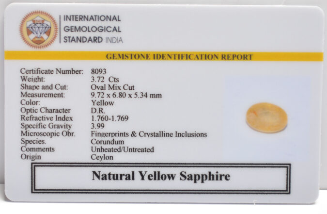 Beautiful 3.72 Cts Natural Yellow Sapphire (AAA+-Mines) sva 4+ Ratti YELLOW SAPPHIRE. Free Horoscope & Free Pundit Ji Astrological Advise / Consultation. Original Natural Lab certified gems by IGI GTL / Birth stones / Large Gem Selection of shree shubh Rashi Ratan Vedic dhan at Gem Mines. May Bhagwan Brahma, Vishnu, Shiv & Universe bless you.